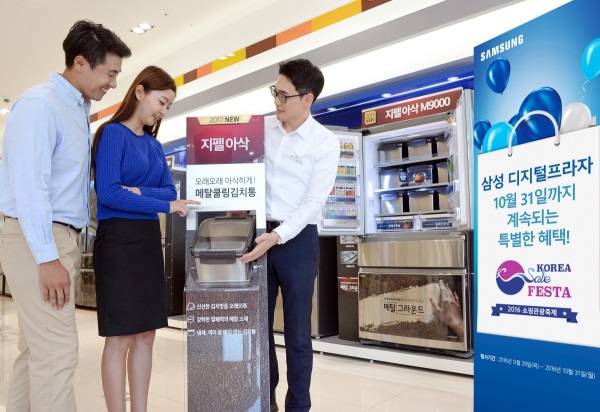 삼성디지털프라자는 가전제품과 IT기기 등 총 12개 품목을 출고가 기존 최대 53%까지 할인 판매하는 기존 혜택과 더불어 김치냉장고 미리장만 대축제를 추가했다.
