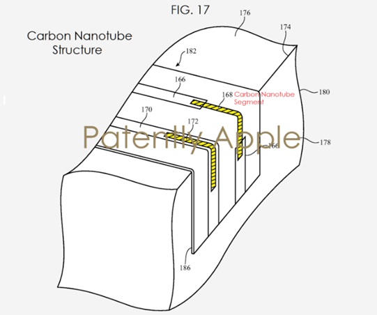 출원서류는 접는 아이폰에 사용될 가능성있는 재료로 세라믹,글래스,섬유, 알루미늄,플라스틱 등도 거론하고 있다. 특히 사용될 가능성이 가장 높은 재료로 탄소나노튜브를 구체적으로 거론하고 있다.
