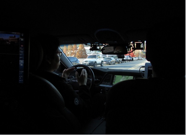 15일 시연행사에서는 서울대학교 관악캠퍼스에서 4km에 이르는 시험주행 구간을 안드로이드 스마트폰 앱으로 선택해 자율주행을 시연했다.