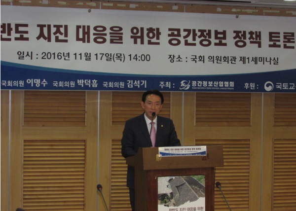 [글로벌이코노믹 이재구 기자] 17일 국회 의원회관 제1세미나실에서 열린 한반도지진대응을 위한 공간정보 정책토론회를 공동주관한 김석기 의원(새누리당 경주)이 인사말을 하고 있다. 이명수 의원(새누리당), 박덕흠 의원(새누리당) 등이 공동주관했다. 이재구 기자 jklee@