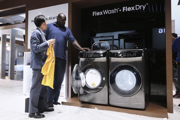 이미지 확대보기샤킬 오닐이 5일(현지시간) 미국 라스베이거스에서 개막한 CES 2017에서 삼성전자 전시관을 방문해 플렉스워시 세탁기와 플렉스드라이 건조기를 보고 있다. 플렉스워시와 플렉스드라이는 2개의 독립 공간을 일체형으로 설계, 소비자의 다양한 요구를 맞춤형으로 해결해 주는 신개념 세탁 시스템이다. 사진=삼성전자
