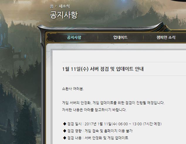 리그 오브 레전드 제작사 라이엇 게임즈는 게임서버 안정화를 위해 11일 오전 6시부터 오후 1시까지 7시간 동안 롤점검이 진행된다고 10일 밝혔다.