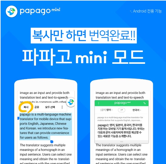 이미지 확대보기네이버가 인공지능(AI)기술 기반의 자동통역 앱 ‘파파고(papago)’의 업데이트를 통해 새롭게 ‘미니(mini)’ 기능을 선보였다.