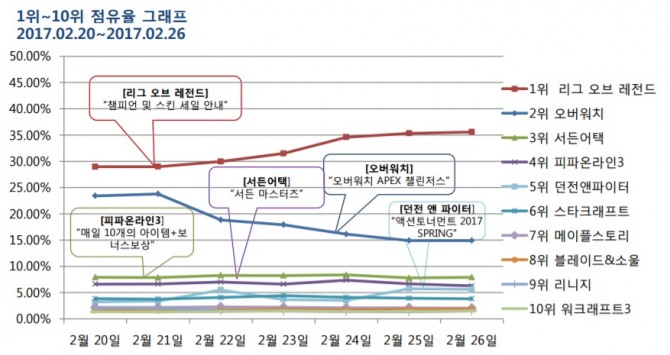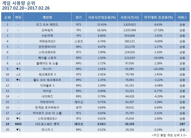 워크래프트3의 경우 전주대비 증감율이 2.45% 증가해 1단계 상승한 10위에 랭크되면서 10위권 안으로 재진입했다.