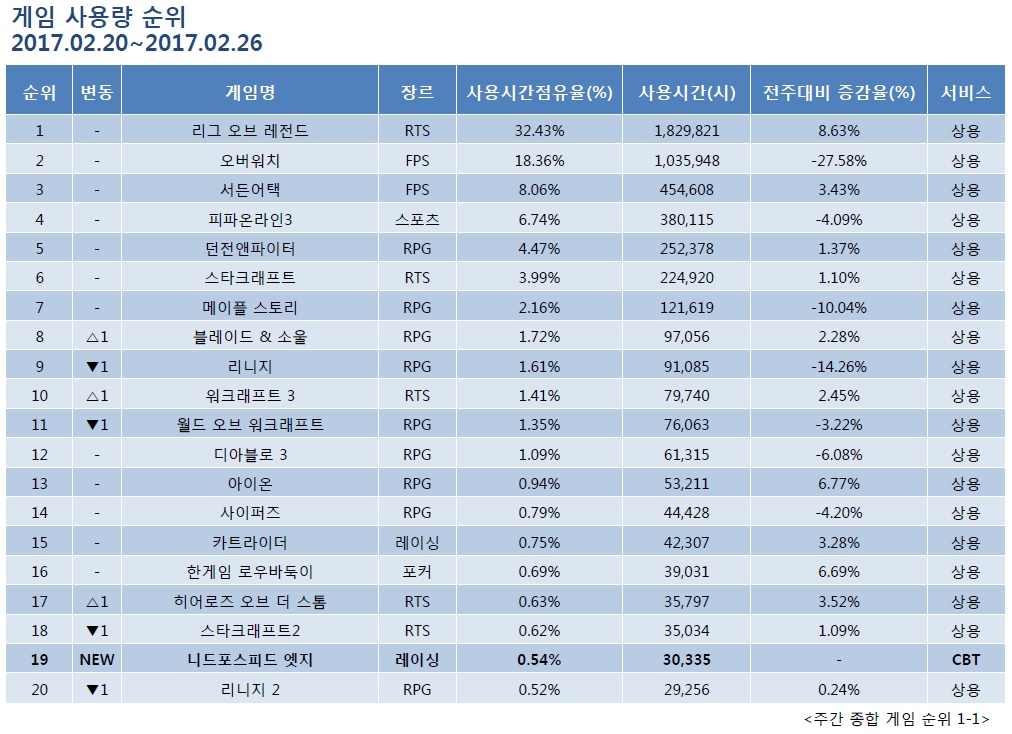 11~20위권 게임 중에는 아직 정식 오픈을 하지 않은 니드포스피드 엣지의 선전이 눈길을 끌고 있다. 온라인게임에서 찾아보기 힘든 레이싱 장르라는 점에서 의미가 있다는 평가다. ‘니드포스피드 엣지‘의 2월3째주 순위를 살펴보면 전체 게임순위 19위, 장르내 순위 2위에 랭크돼 있다. 세부적으로 전체 점유율 0.54% , 장르내 점유율 33.01%를 기록했다.
