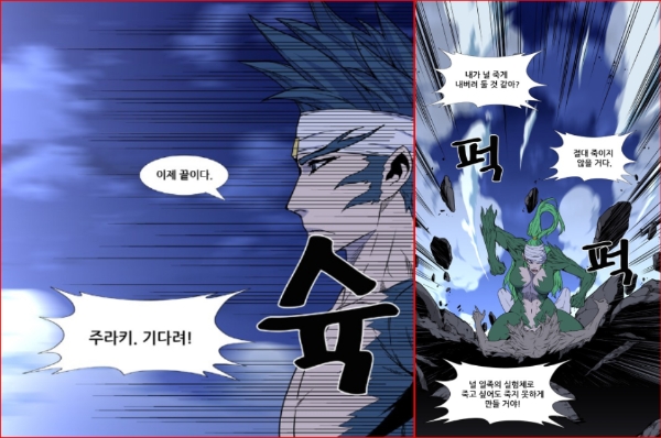 이미지 확대보기화요웹툰 '노블레스 456'화에서는 일족의 전사인 주라키와 루나크의 싸움에서 루나크가 가까스로 살아나게 된다. /사진=네이버 화요웹툰 노블레스 화면 캡처[글로벌이코노믹 이해성 기자] 화요웹툰 '노블레스 456화'가 1만2455명 조회수를 기록하며 네티즌들의 인기를 끌고 있다.