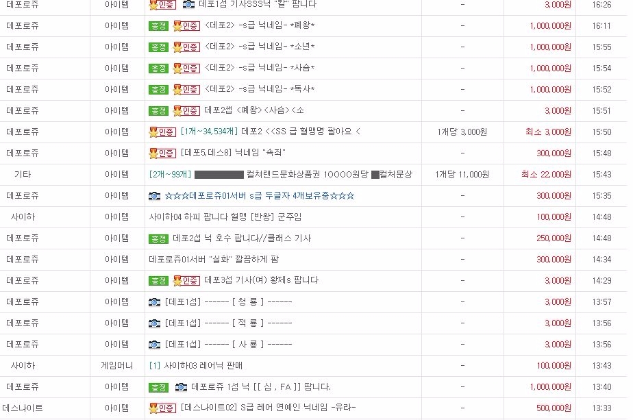 이미지 확대보기“판도라1섭SSS급 군주 닉(닉네임): 최고 혈맹:최고 팝니다.”, “ sss닉넴 폐 팝니다 10섭.”