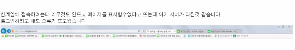 한 게임유저는 "한게임에 접속하려는데 아무것도 안뜨고 페이지를 표시할수없다고 뜨는데 이거 서버가 터진것 같다"라며 "로그인하려고 해도 오류가 뜨고 있다"고 상황을 전했다.