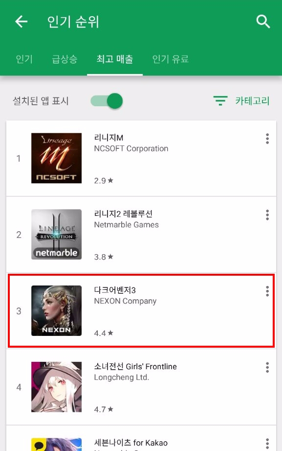 이미지 확대보기27일 국내 출시된 ‘다크어벤저3’는 출시 하루 만에 애플 앱스토어 최고매출 2위, 인기 순위 1위를 기록했다. 30일 구글 플레이 스토어 순위 집계 결과 최고매출 3위, 인기 순위 1에 올랐다.