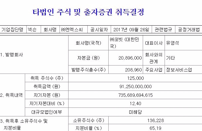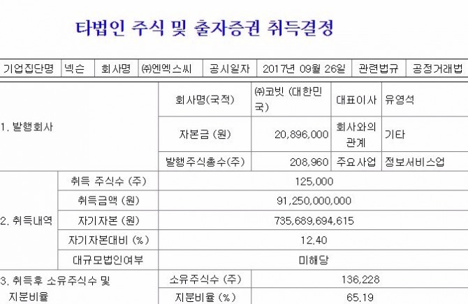 이미지 확대보기엔엑스씨는 코빗의 지분 65.19%를 매수해 경영권을 인수하는 내용의 주식 매매계약을 체결했다고 26일 전자공시시스템에 공시했다. 취득 시점은 지난 20일이다.