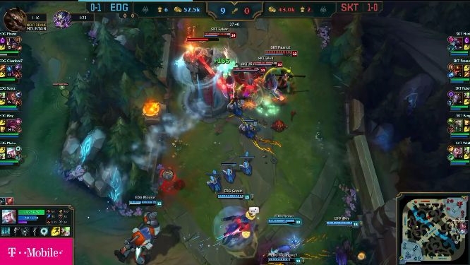 이미지 확대보기SKT T1은 탑 라인 근처에서 EDG의 미드라이너 ‘스카웃’의 루시안을 이예찬을 급습했지만 이예찬이 E스킬과 플래쉬를 적절히 사용하며 살아나며 위기를 맞았다.