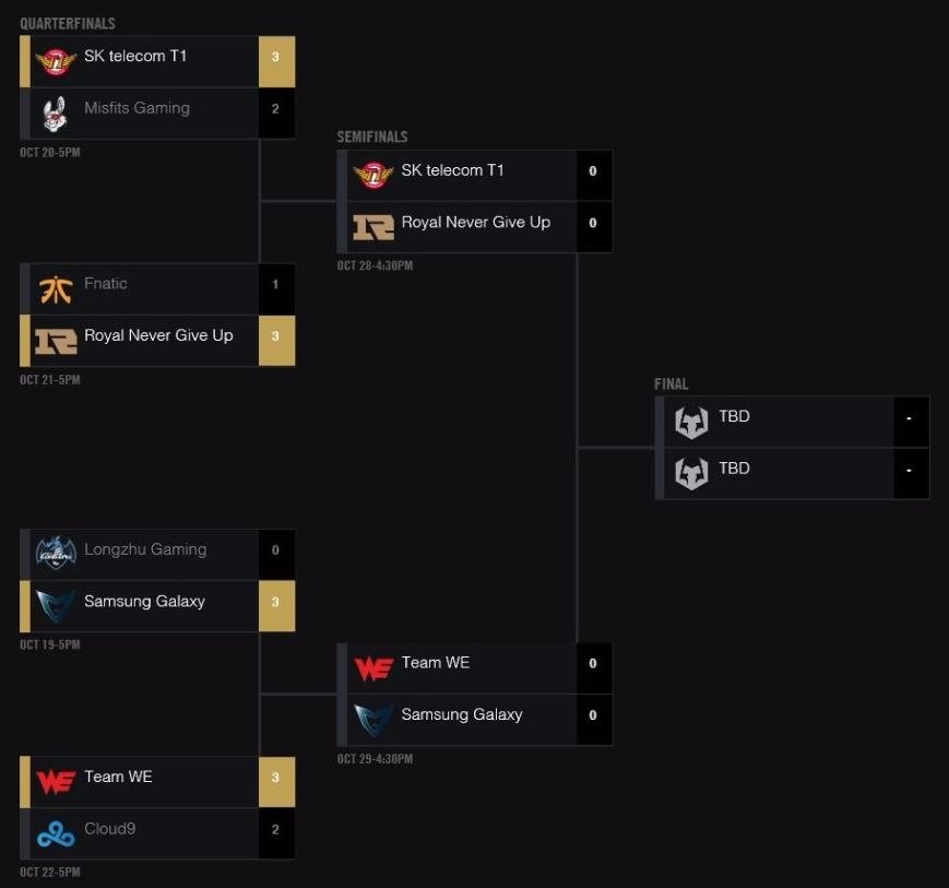 29일 4강전 2경기에서는 삼성 갤럭시와 팀 WE가 결승 진출을 놓고 싸운다. 팀 WE는 8강에서 북미의 클라우드9와 손에 땀을 쥐게 하는 승부 끝에 3대2로 누르고 4강 진출에 성공했다.