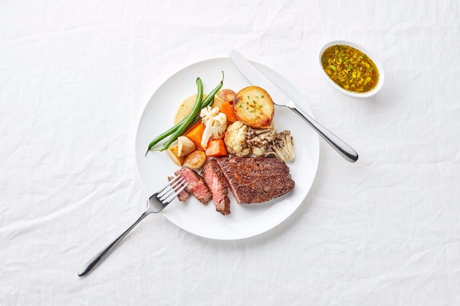 치미추리 부채살 스테이크는 4시간 동안 수비드(Sous-Vide)로 조리한 부채살을 철판에서 시어링한 메뉴다. 아르헨티나의 대표 소스 치미추리 소스에 마늘, 샬롯, 애느타리 등 풍성한 가니쉬가 곁들여 진다.