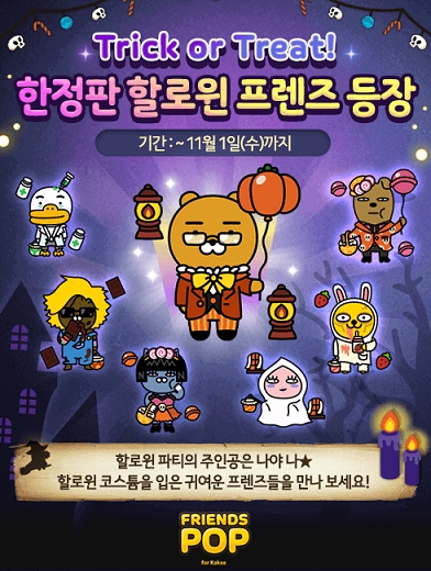 ‘프렌즈팝’은 4~5성 할로윈 한정판 프렌즈를 출시했다. 11월 1일까지 유령 어피치, 초코매니아 제이지, 딸기중독 무지, 백신 튜브, 호박집사 라이언, 알사탕 네오, 알사탕 프로도 총 7종의 귀여운 할로윈 프렌즈를 획득할 수 있다.
