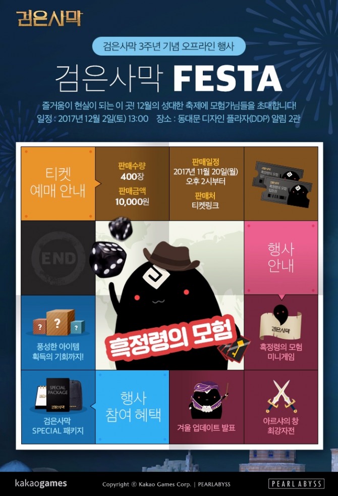 이미지 확대보기이번 행사를 통해 대대적인 업데이트 ‘뉴에이지(New Age)’ 프로젝트의 계획을 발표한다. 흑정령의 모험을 컨셉으로 한 미니게임과 2대 2 PVP 대회 ‘아르샤의 창 2017 최강자전’ 등 현장 이벤트가 열린다. 행사 참가자들에게 특별 제작한 흑정령 스노우볼, 2018년 달력, 가방 등의 선물을 제공할 예정이다.