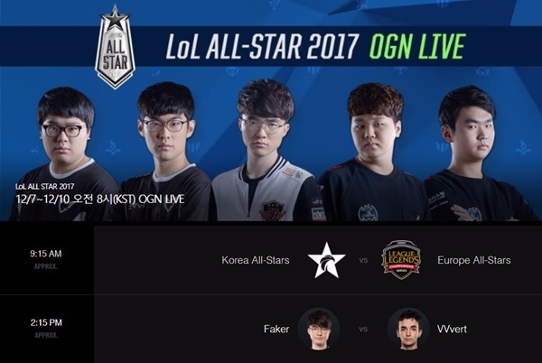 ´2017 롤올스타전´은 8일부터 11일까지 진행된다. 한국 올스타 팀은 삼성 갤럭시(KSV가 인수)의 ´큐베´ 이성진, ´앰비션´ 강찬용과 SK텔레콤 T1 ´페이커´ 이상혁, 롱주 게이밍 ´프레이´ 김종인, ´고릴라´ 강범현이 한 팀이 됐다.