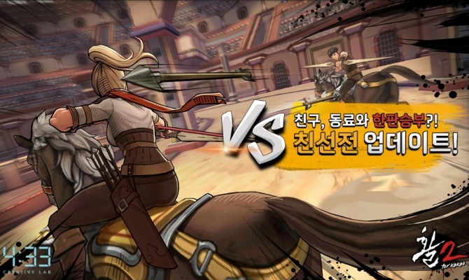 [글로벌이코노믹 신진섭 기자] 네시삼십삼분(이하 4:33)은 자체 개발한 모바일 액션 아케이드 게임 ‘활2 for kakao’(이하 활2)에 ‘친선전’을 업데이트하고 크리스마스 이벤트를 진행한다.