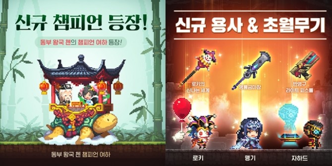 사 3종과 함께 신규 초월무기 3종 ‘반영구 라이트 피스톨’과 ‘맹룡금마창’, 그리고 ‘로키의 신나는 세계’가 추가됐으며, ‘보르봉봉’과 ‘요리부장 레이 링’, ‘켄타우로스 케이론’, ‘문어빵 모모타로’ 등 6종의 코스튬도 새롭게 만나볼 수 있다.