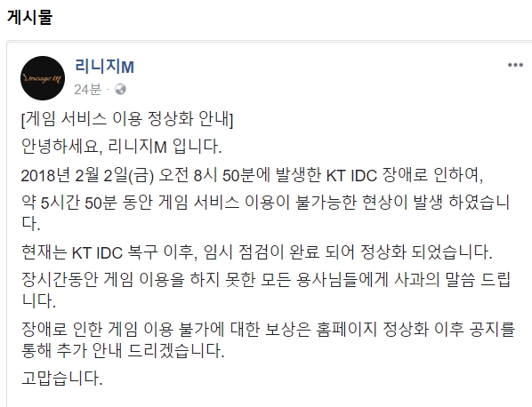 이날 오전 8시 50분에 발생한 KT IDC 장애로 인해 약 5시간 50분 동안 게임 서비스 이용이 불가능한 현상이 발생했다. 아직까지 리니지M 홈페이지는 점검중이지만 리니지M 앱을 통해 접속이 가능해졌다.