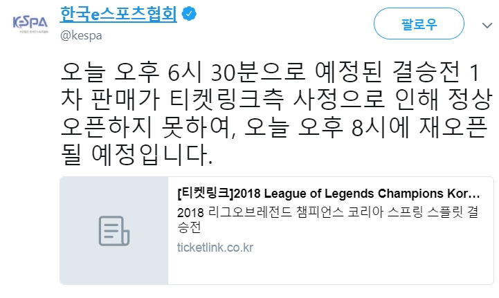 이에 e스포츠협회 측은 “오늘 오후 6시 30분으로 예정된 결승전 1차 판매가 티켓링크측 사정으로 인해 정상 오픈하지 못하여, 오늘 오후 8시에 재오픈 될 예정입니다”라는 글을 남겼다.