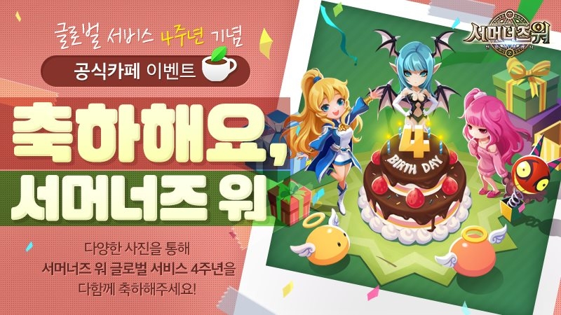 ‘서머너즈 워’ 글로벌 서비스 4주년을 축하하는 마음을 담아 이벤트 게시물에 재미있게 꾸민 게임 스크린샷 또는 사진 등을 축하 메시지와 함께 댓글로 남길 수 있으며, 재치 넘치는 이미지를 게재한 참가자에게는 다양한 아이템 및 경품을 선물로 제공한다.