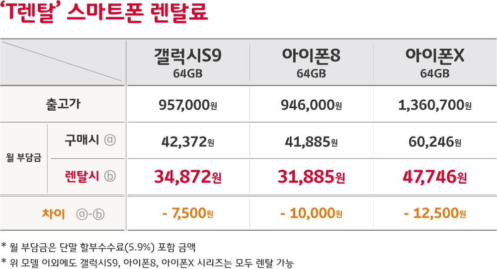 이 서비스의 월 렌탈료는 ▲아이폰X 64GB 4만 7746원 ▲아이폰8 64GB 3만1885원 ▲갤럭시S9 64GB 3만 4872원이다. 스마트폰을 할부로 구매할 때의 월 할부금보다 각각 1만 2500원, 1만원, 7500원 저렴하기 때문이다.