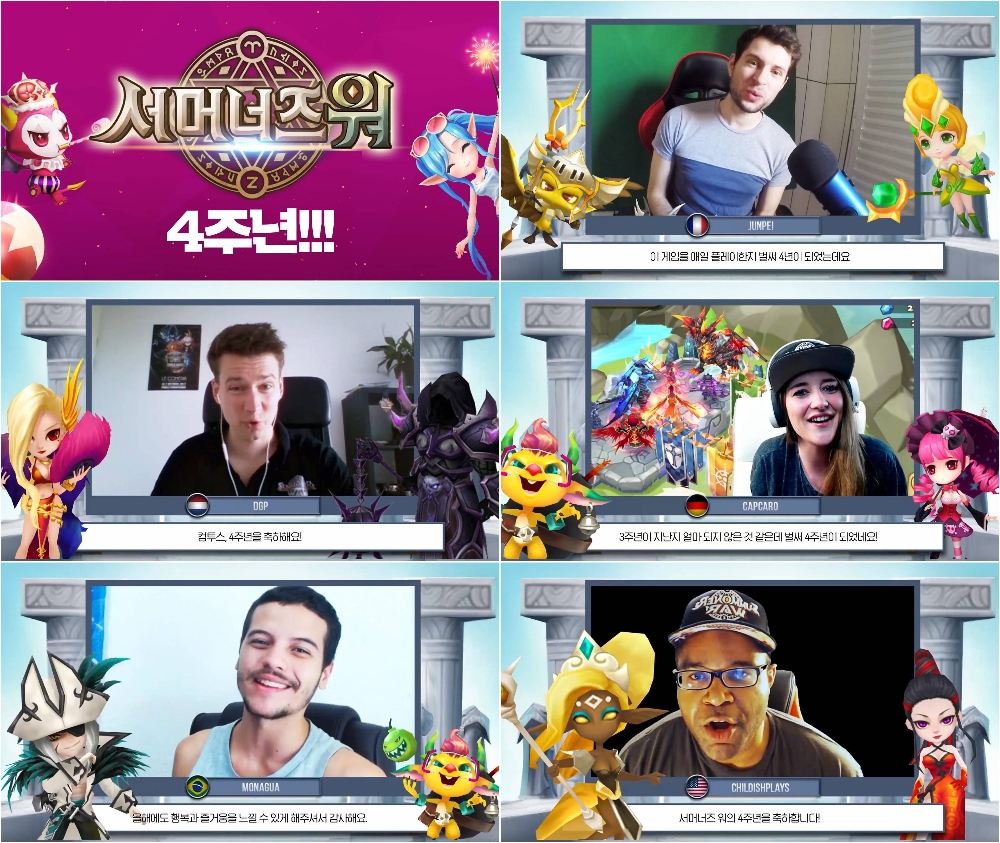 이미지 확대보기이번 영상은 ‘서머너즈 워’ 글로벌 서비스 4주년을 기념해 각 지역에서 활동중인 ‘서머너즈 워’ 인플루언서들과 유저들이 보내온 축하 영상을 바탕으로 제작됐다.