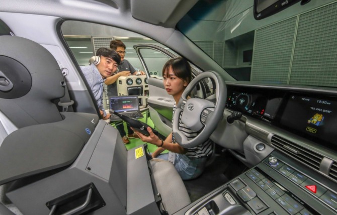 이미지 확대보기현대·기아차와 카카오는 인공지능 플랫폼 '카카오 i'의 기술이 적용된 스마트 스피커 '카카오미니’ 기능을 2019년 이후 현대·기아차에 탑재하는 것을 목표로 공동 개발 프로젝트를 시작했다. 사진은 현대·기아차 연구원들이 남양연구소에서 지능형 음성인식 비서 서비스 기술을 개발하고 있는 모습.