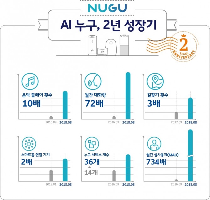 지난 2년간 AI ‘누구’ 이용자는 출시 첫 달 102만 1000건으로 시작한 대화량은 지난 8월 7343만 8000건으로 72배 늘었으며, 월간 실사용자(MAU)는 같은 기간 5280명에서 387만 5000명으로 734배 뛰어올랐다.