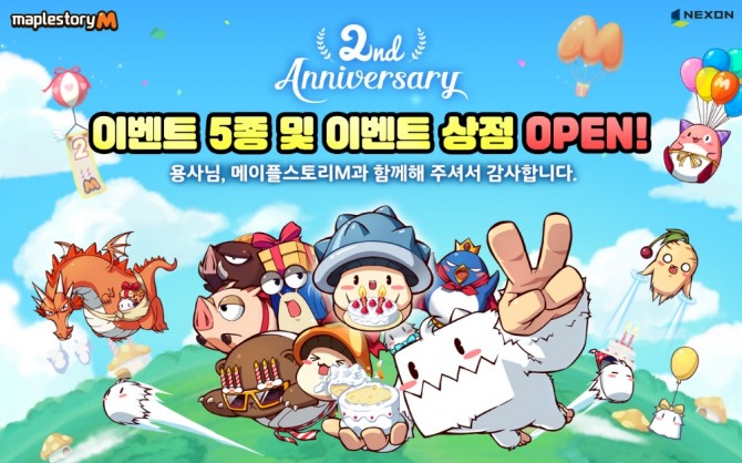 이용자는 이벤트 5종에서 얻은 기념 주화를 사용해 ‘2주년 기념 장비’, ‘메이플M 2주년 모자’, ‘퍼펙트 각인의 인장’, ‘유니크 잠재능력 주문서 50%’ 등 높은 가치를 지닌 아이템을 상점에서 구매할 수 있다.