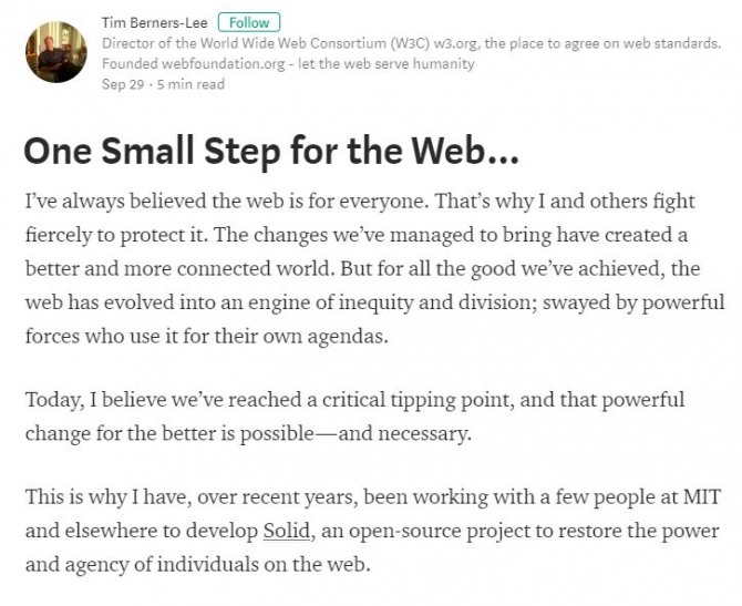 그가 얘기하고 있는 것은 '솔리드' 시스템으로 불린다. 팀 버너스 리는 지난 9월 29일 자신의 블로그에 솔리드와 관련된 포스트를 올렸다.