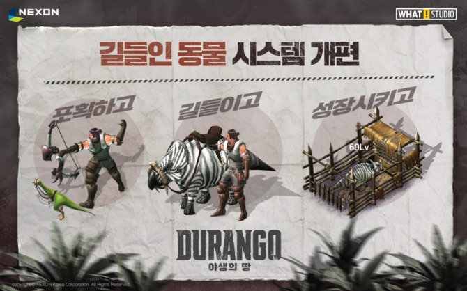 넥슨(대표 이정헌)은 13일 왓 스튜디오(What! Studio)에서 개발한 개척형 오픈월드 MMORPG ‘야생의 땅: 듀랑고(Durango: Wild Lands)’에 ‘길들인 동물 시스템’ 개편 업데이트를 실시했다.