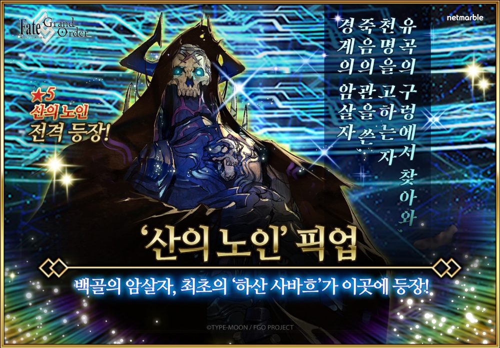 넷마블은 스토리 수집형 모바일 RPG '페이트/그랜드 오더'에 ★5(SSR) '산의 노인' 소환 캠페인을 진행한다.