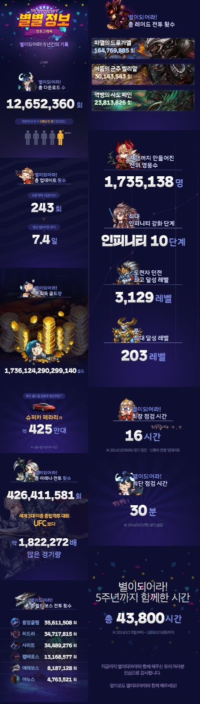[글로벌이코노믹 김인별 기자] 게임빌(대표 송병준)이 히트작 ‘별이되어라!’의 서비스 5주년을 기념해 인포그래픽을 18일 공개했다.