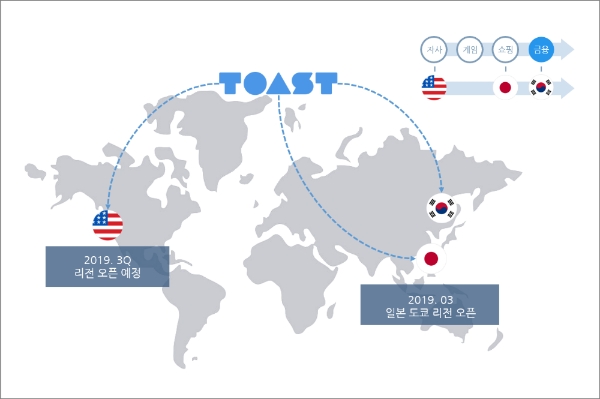 한편 NHN엔터테인먼트는 일본을 시작으로, 토스트의 글로벌 사업 행보를 이어간다. 토스트의 글로벌 사업은 현지 기업을 대상으로 한 직접 진출 방식으로 진행되며, 자사 법인 중심의 검증, 게임/쇼핑 분야, 금융/공공 분야 순으로 단계별 확대 전략을 펼칠 예정이다. 북미 리전은 오는 3분기에 오픈 예정이다.