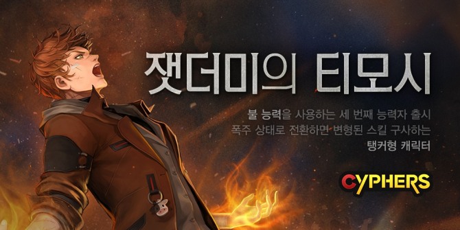 지난 오프라인 유저 쇼케이스 ‘THE UNION’에서 첫 공개된 ‘티모시’는 ‘사이퍼즈’의 63번째 캐릭터로, ‘타라’, ‘나이오비’에 이어 세 번째로 불의 힘을 사용하는 능력자다. 기본 상태에서는 주황색 불꽃을 보이며 약한 공격력을 나타내지만, 폭주 상태에는 파란색 불꽃을 뿜으며 공격적인 면모를 보이는 것이 특징이다.