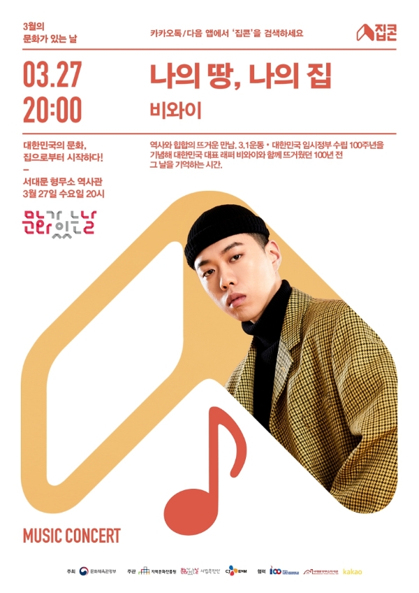 라이브 무대에 이어서는 방송인 박슬기가 스페셜 MC로 나서 비와이와 토크를 통해 풍성한 시간을 가질 예정이다. 27일 ‘나의 땅, 나의 집’ 생중계는 카카오톡 #탭(샵탭)과 Daum 앱을 통해 시청할 수 있고 카카오톡 오픈채팅방을 통해 실시간으로 비와이와 소통할 수 있는 기회도 주어진다. 이후에는 카카오TV에 마련된 ‘문화가 있는 날, 집콘’ 채널에 올라오는 VOD로 언제 어디서나 다시보기 할 수 있다.