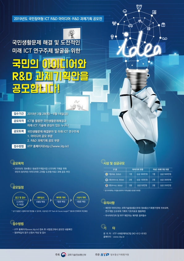 이번 공모전의 상금은 총 2350만원이다. 심사를 거쳐 12개 우수 제안에 대해 상장과 상금을 수여한다. 선정된 우수 아이디어와 제안서는 오는 2020년 과기정통부의 신규 연구개발 과제 기획에 적극 반영해 관련 기술개발을 추진할 예정이다. 공모 참여는 6월14일까지 정보통신기획평가원 홈페이지에서 가능하다.