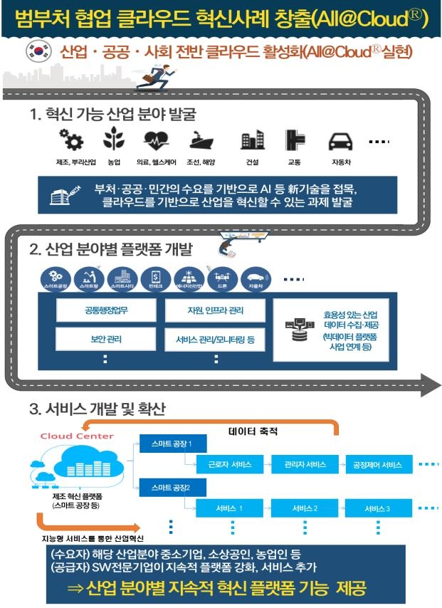 부처별 소관 정책‧산업 분야 데이터를 클라우드에 올리고 인공지능, 빅데이터 등 신기술과 융합하여 4차 산업혁명을 체감할 수 있도록 하는 All@CloudⓇ 전략의 첫걸음이 시작되는 것이다.