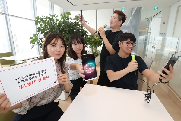 이미지 확대보기KT는 16일 5G 스마트 노래방 앱 ‘싱스틸러(Sing-Stealer)’를 출시했다. 싱스틸러는 KT의 5G 초저지연 기술을 활용해 최대 4명이 동시에 한 화면에서 영상으로 노래를 부를 수 있는 서비스다. 국민 누구에게나 친근한 노래방 서비스에 5G 초지연성을 적용했다는 점이 특징이다.