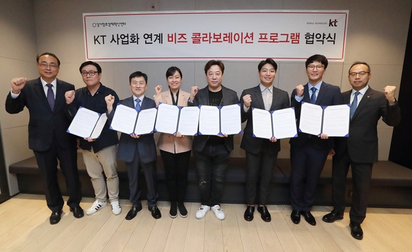 왼쪽부터 경기창조경제혁신센터 이경준 센터장, 코아소프트 이정훈 대표, 페타바이코리아 박현규 대표, 애프터레인 이윤희 대표, 오아시스VR 신준우 대표, 굳브로 진성규 대표, 에이테크 김정완 대표, KT SCM전략실장 박종열 상무가 ‘비즈콜라보레이션 협약’을 마치고 기념 촬영을 하고 있다. (사진=KT)