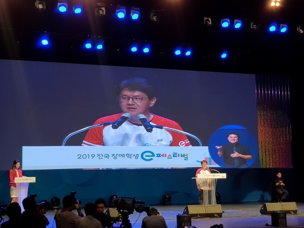 3일 서울 양재동 더케이 서울호텔에서 e스포츠 대회 참가 학생들의 소감이 울려퍼졌다. 한국콘텐츠진흥원, 국립특수교육원과 넷마블문화재단이 공동 주최하는 '2019년 전국 장애학생 e페스티벌'이 이틀간의 일정으로 개막되는 순간이었다. 행사 첫날인 이날 행사는 개회식, 정보경진대회, e스포츠대회 본선 순서로 진행됐다.