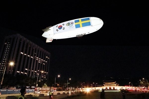 스웨덴 스톡홀름과 5G로 연결된 KT 5G 스카이십이 서울 광화문 광장 상공을 비행하고 있다. 사진=KT
