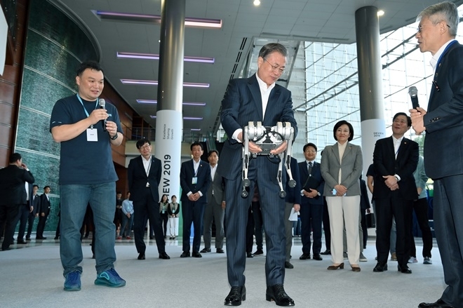문재인 대통령이 28일 네이버랩스가 주최한 국내 최대 개발자 컨퍼런스 ‘데뷰(DEVIEW) 2019’에 참석, 미니치타 로봇 시연후 이를 들어보고 있다. 사진=네이버