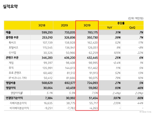 이미지 확대보기카카오는 분기중 매출액 7832억 원, 영업이익 591억 원을 각각 기록했다. 역대 최대 매출이자, 2015년 이래 최대 분기 영업이익 실적이다.