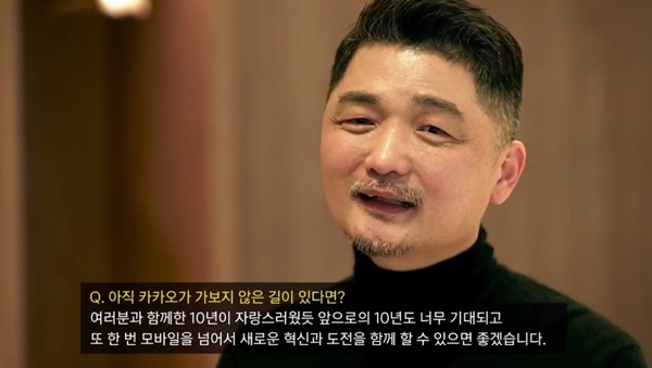 이미지 확대보기18일 김 의장은 카카오톡 출시 10주년을 기념해 카카오TV 앱에 임직원(크루)들에게 출시 10년을 맞은 소회와 앞으로의 방향을 전했다.