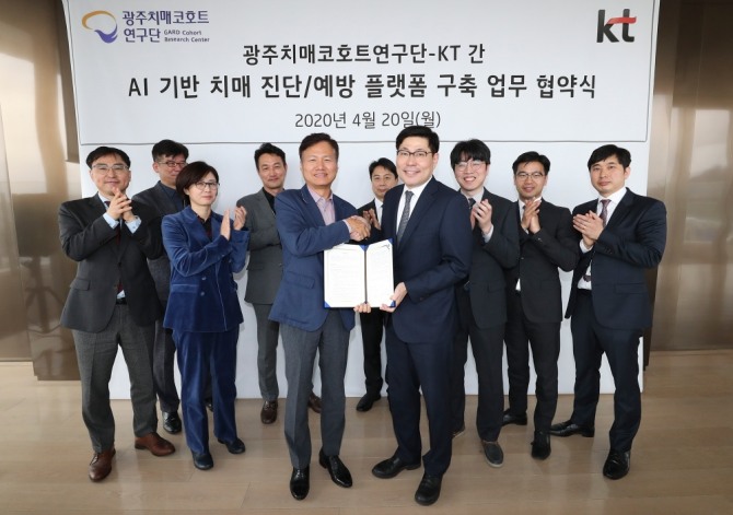 이미지 확대보기20일 오전 서울 KT 광화문빌딩 East에서 열린 협약식에는 KT 클라우드/DX 사업단 윤동식 전무, 조선대 광주치매코호트연구단 이건호 단장 등 관계자들이 참석했다.