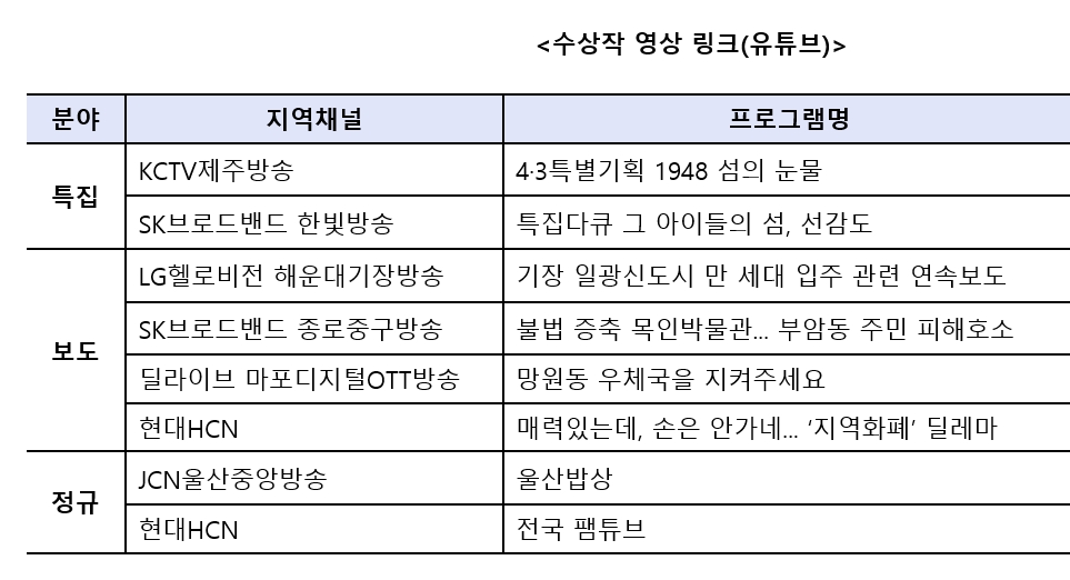 보도분야 수상작에는 ’기장 일광신도시 만 세대 입주 관련 연속보도(LG헬로비전 해운대기장방송)’, ‘불법 증축 목인박물관... 부암동 주민 피해호소(SK브로드밴드 종로중구방송)’, ‘망원동 우체국을 지켜주세요(딜라이브 마포디지털OTT방송)’, ‘매력있는데, 손은 안가네... 지역화폐 딜레마(현대HCN)‘이 선정됐다.