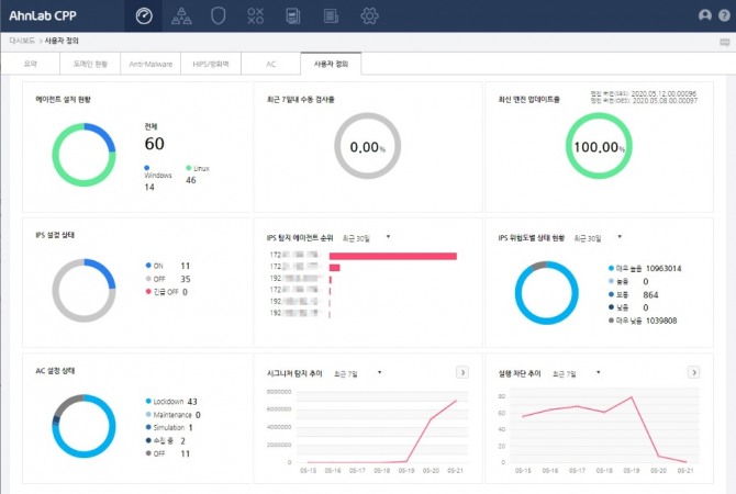 ‘안랩 CPP’는 클라우드 및 하이브리드 환경의 서버에 대한 보안 가시성과 관리 편의성도 제공한다. ‘안랩 CPP’는 시각화 대시보드를 제공해 클라우드 및 하이브리드 환경의 서버 워크로드에 대한 보안 상태를 직관적으로 보여준다. 또한, 보안 관리자는 ‘안랩 CPP’의 단일 관리(싱글 매니지먼트) 콘솔로 호스트 방화벽, 네트워크 침입 공격 탐지/방지(Host IPS), 악성코드 검사 등 연동된 안랩 보안 솔루션의 다양한 기능을 편리하게 통합 관리할 수 있다.