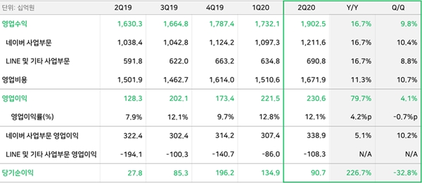 네이버는 올해 2분기 매출액 1조 9025억 원, 영업이익 2306억 원으로 전년 동기 대비 각각 16.7%, 79.7%씩 증가했다.
